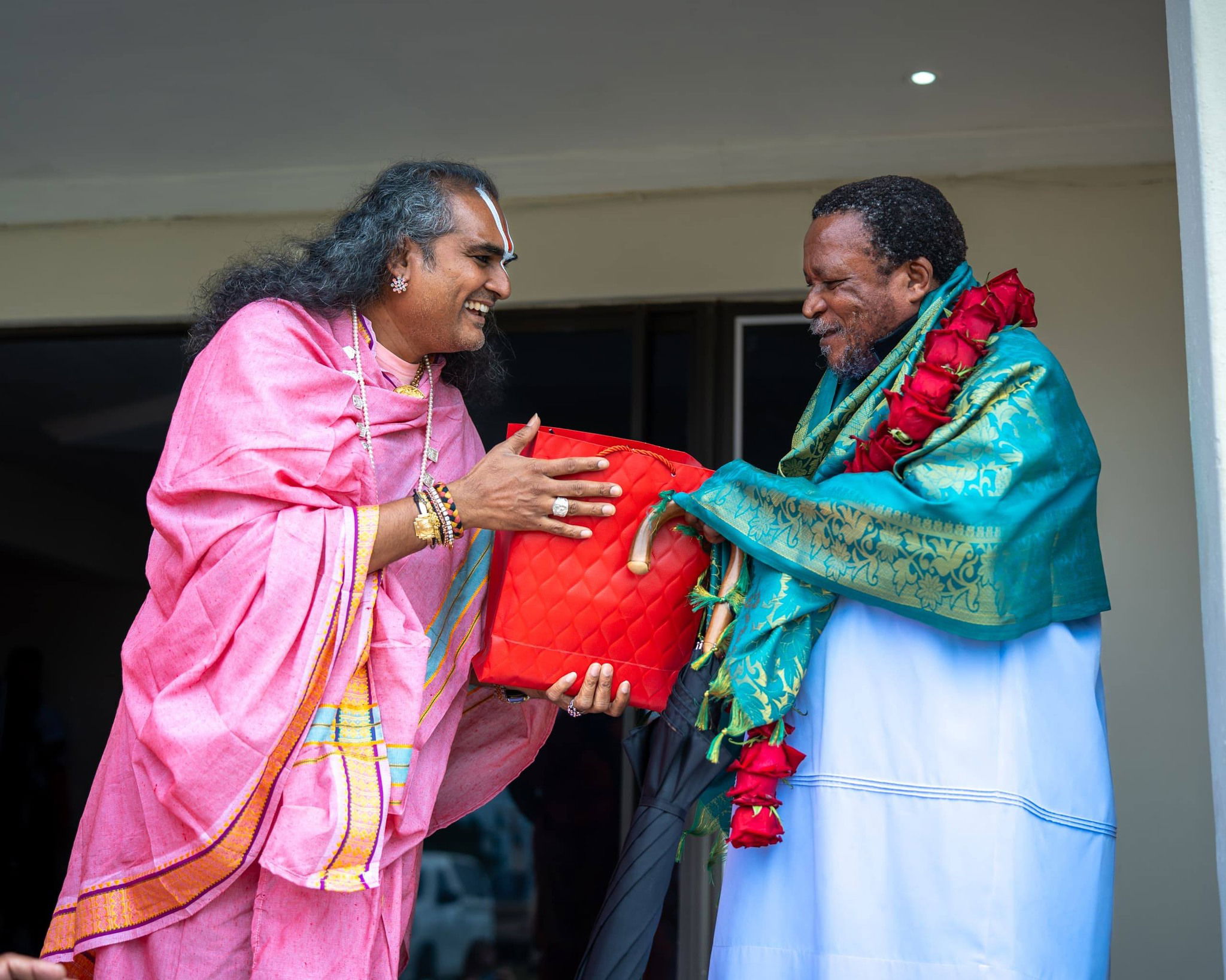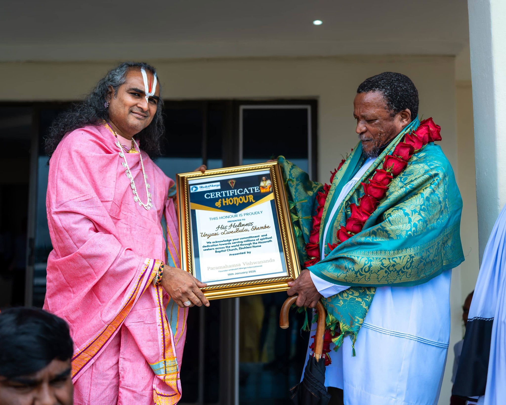 They exchanged words of wisdom and appreciation towards each other’s cultures and traditions. This historic meeting to forged friendship of a lifetime. The spirit of unity in diversity was at the forefront of two great masters. Paramahamsa Vishwananda presented His Holiness Unyazi LweZulu Shembe with a special recognition of Honour and presented a garland of Roses to Unyazi LweZulu Shembe.