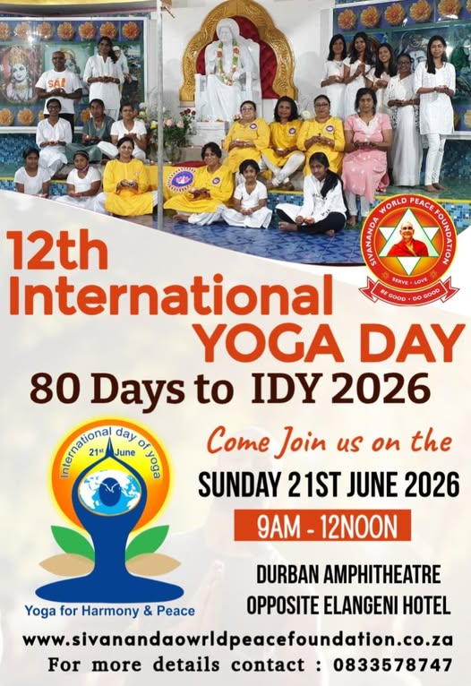 12th International Day of Yoga in KwaZulu-Natal at the Durban Amphitheatre opposite Elangeni Hotel. Creating Oneness and togetherness amongst the citizens of South Africa through Yoga. Sathya Sai Sudha Mandir Institute of Yoga supports IDY 2026