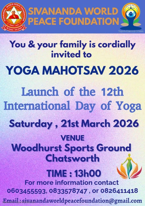 The 12th International Day of Yoga is KwaZulu Natal’s official Yoga programme and we encourage all citizens to be part of the celebration of Yoga — India’s ancient discipline of physical, mental, and cultural well‑being said Premier Thami Ntuli.Prince Ishwar Ramlutchman Mabheka Zulu, founding president of the coordinating hosts, the Sivananda World Peace Foundation, said that following the success of the 2025 International Day of Yoga, Chatsworth — the historic 62‑year‑old township of more than 200 000 residents — was the natural choice to host the Yoga Mahotsav 2026 launch.The launch event will take place at 1pm on Saturday, 21 March, at the Rajput Hall, in the heart of Chatsworth — significantly on Human Rights Day, a public holiday enshrined 30 years ago in South Africa’s democratic era.“Chatsworth, the nation’s most historic township of Indians — now home to a rich mix of communities — is the ideal venue to launch the 2026 International Day of Yoga.