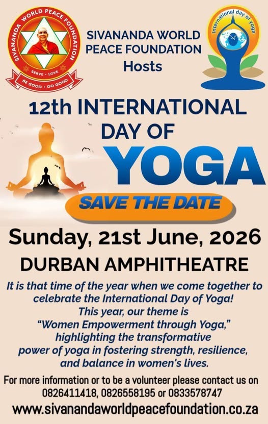 Sivananda World Peace Foundation Hosts KwaZulu Natal Official 12th International Day of Yoga on the 21st of June 2026 at the Durban Amphitheatre opposite Elangeni Hotel. Creating Oneness and togetherness amongst the citizens of South Africa through Yoga.